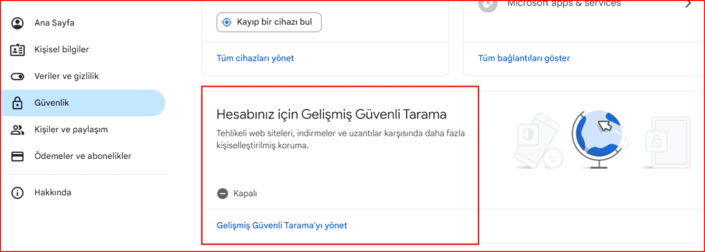 İkinci yapılaması gereken hesap yönetiminden aşağıda resimde bulunan yerin aktif edilmesi gerekmektedir.