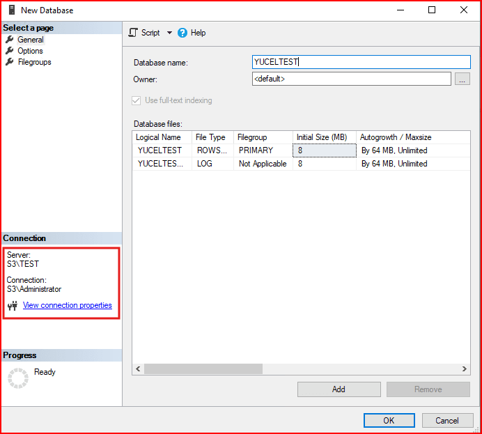 İnstance altında bulunan Databases sekmesine sağ tıklayıp New Database diyiyoruz. Options kısmından Recovery Model’in full olması gerekmektedir.