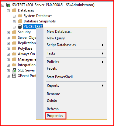 Database oluşturduktan sonra oluşturulan database üzerine sağ tıklayıp Properties kısmına geliyoruz.