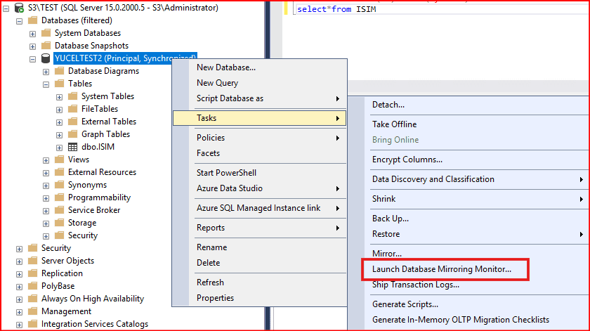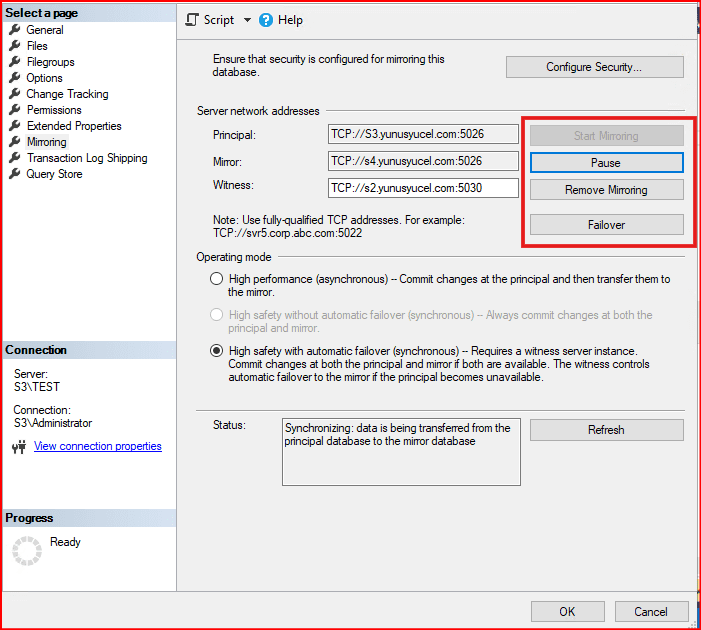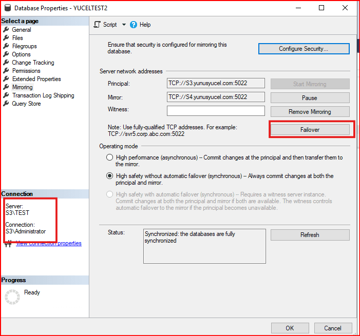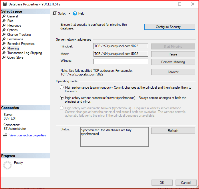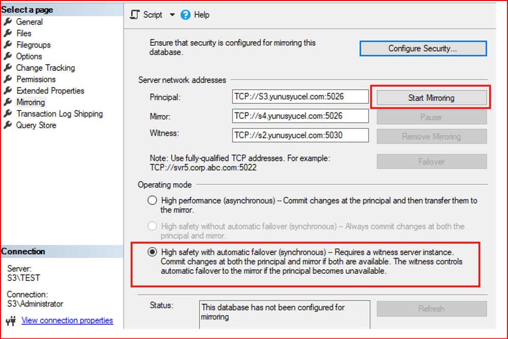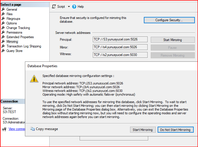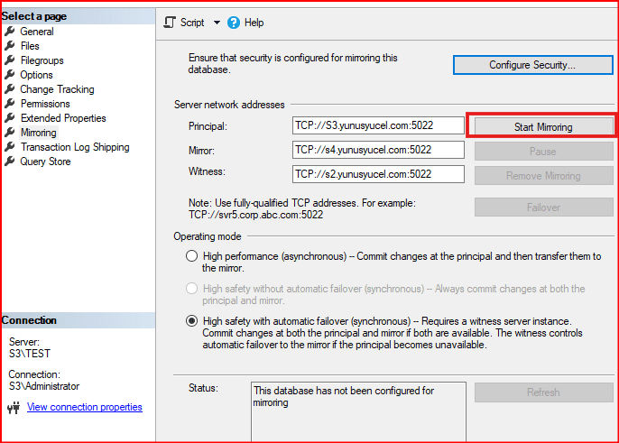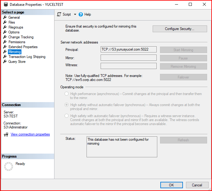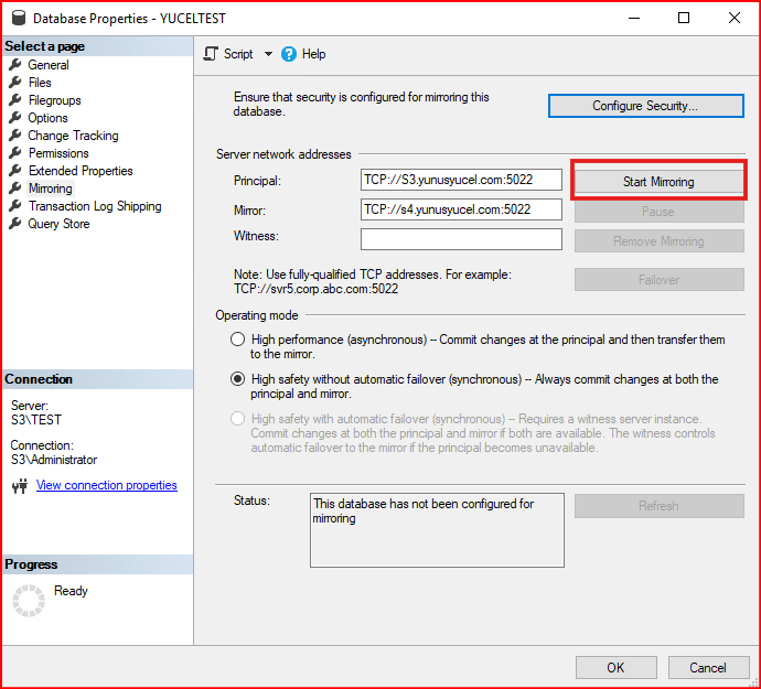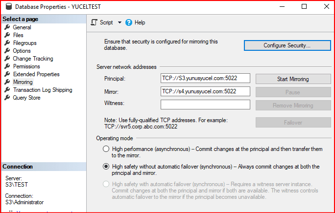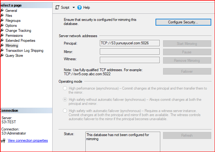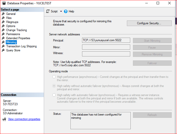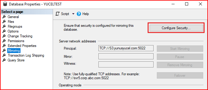 Önceden oluşturduğumuz database’de Mirroring ekranına geliyorum.