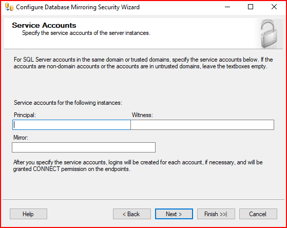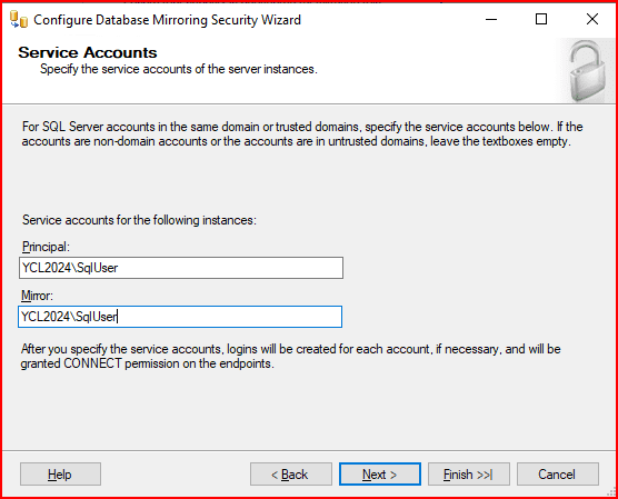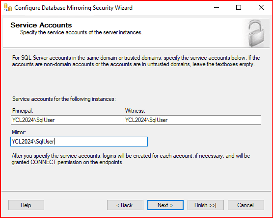 Gelen ekranda principal ve mirror sunucularının sql servis hesaplarını tanımlıyorum. Localde bir kullanıcı seçerseniz hata mesajıyla karşılaşırsınız. Makalenin başında belirttiğimiz gibi aynı servis hesaplarının olması gerekmektedir.