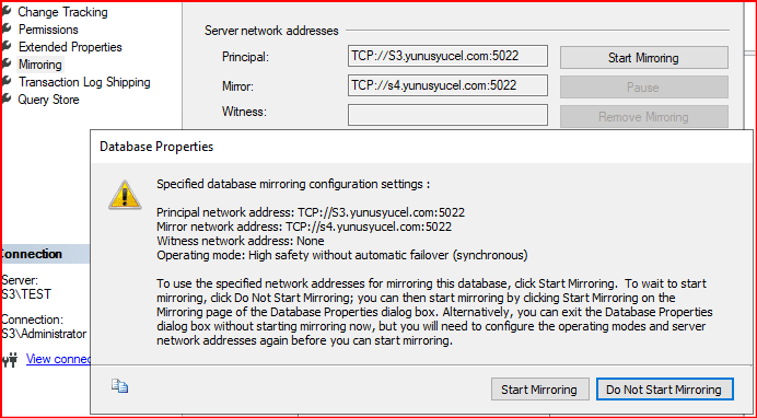 Aşağıdaki ekranda Start Mirroring diyerek database mirroring işlemini başlatıyorum.