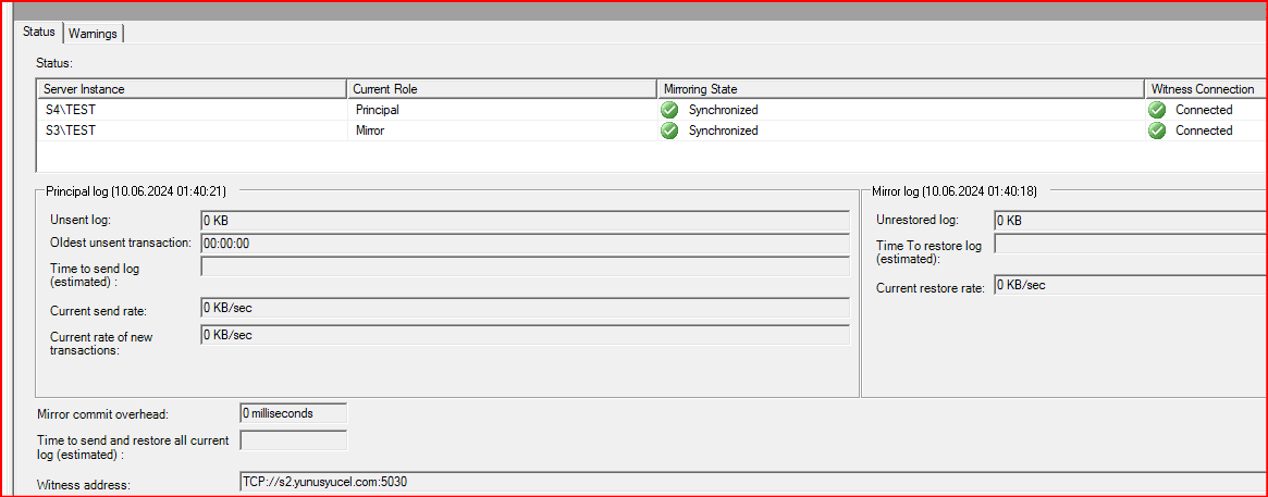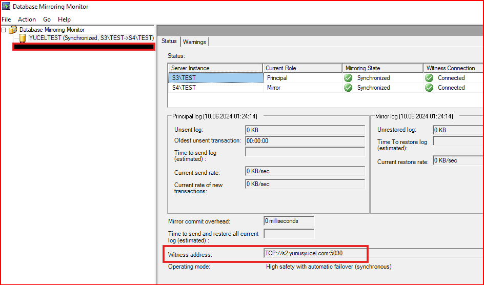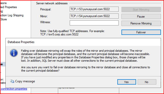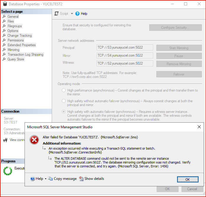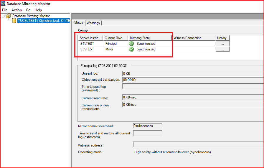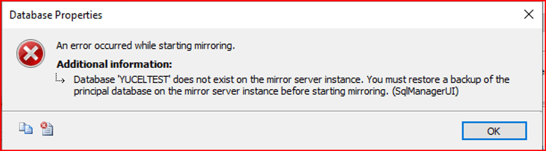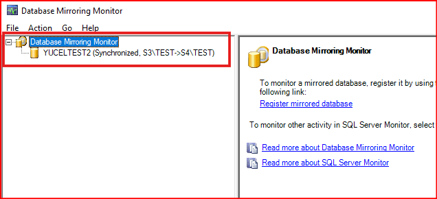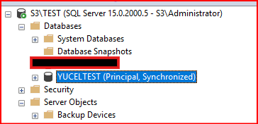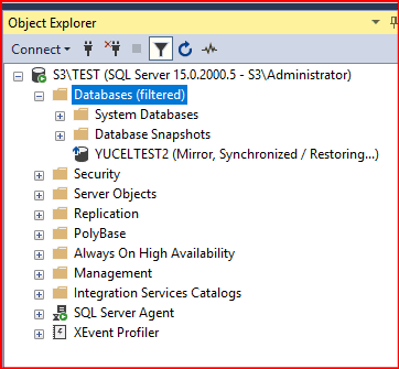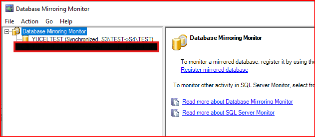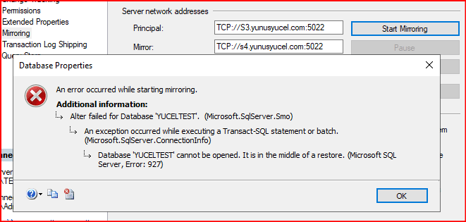 YUCELTEST2 adında başka bir veritabanı oluşturup aynı işlemleri yaptığımda başarılı bir şekilde database mirroring işlemlerimin olduğunu gözlemledim. Yukarıda başlangıç adımları için yaptığım her şeyi yeni database için yaptım. Sunucu veya sql bazında başka bir değişiklik yapmadım. Database’imiz bozulmuş olabilir.