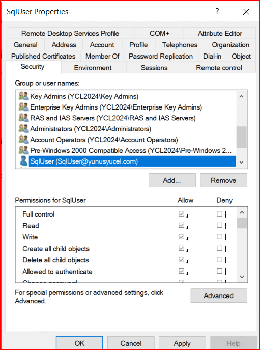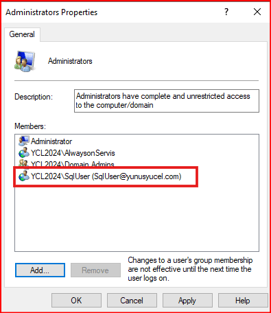 - Database Mirroring yapılandırılması yapacak kullanıcı domain ve server seviyesinde yönetici olmalıdır. SqlUser bizim servis kullanıcısıdır.