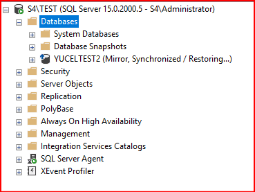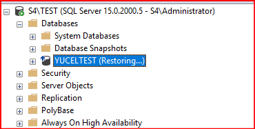 İlk başta S3 sunucusunda YUCELTEST veritabanının full yedeğini alıp S4 sunucusuna no recovery modda restore ediyorum. Bu işlemleri göstermeyip sonucu aşağıda gösteriyorum. Full den sonra log backupda S4 sunucusunda restore edilebilir. Canlı veri akışı olmadığı için gerek duymadım.