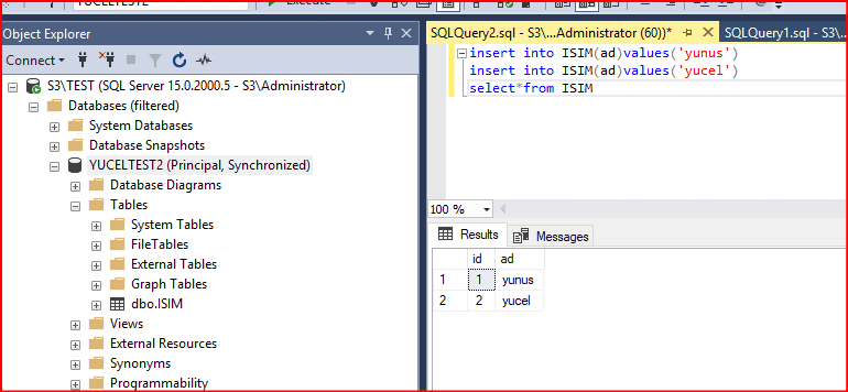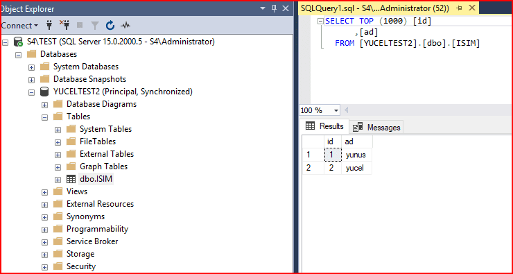 Failover işlemi tamamlandıktan sonra S4 sunucumun principal olduğunu görmüş oluyorum. S3 sunucusunda failover olmadan önce oluşturmuş olduğum tablo ve içindeki verilerinde yeni principal’a(S4) geldiğini görmüş oluyorum.