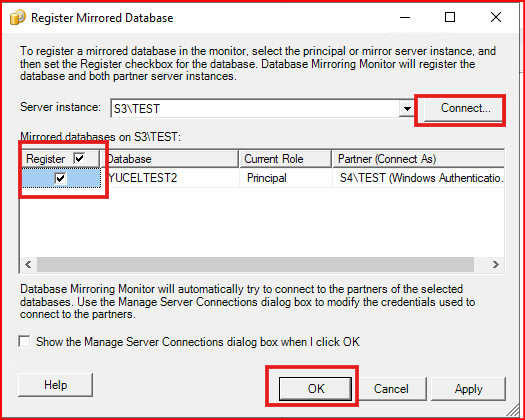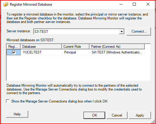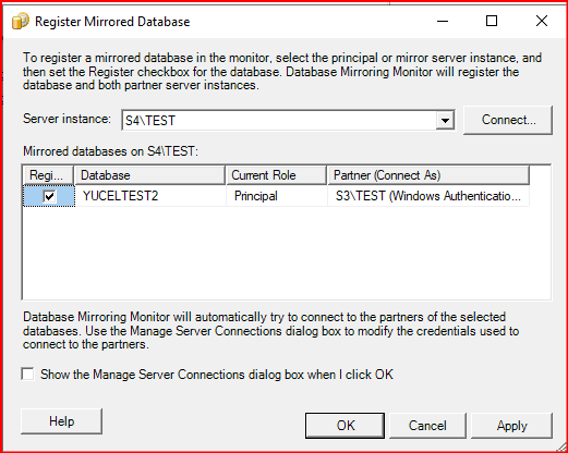 Gelen ekranda Register mirrored database bölüme tıklıyoruz.