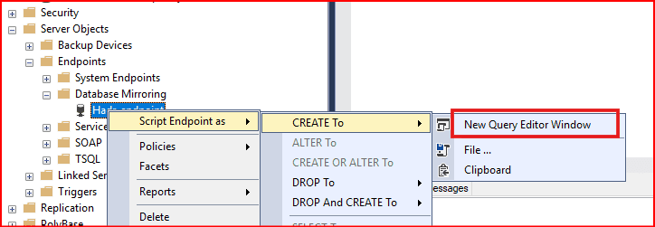 Daha sonra endpoint üzerine sağ tıklayıp Script Endpoint as> CREATE To>New Query Editor Windows kısmından bu endpoint’in scprit’ini alıyoruz.