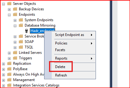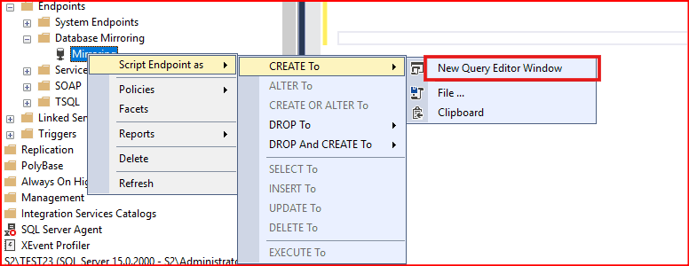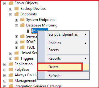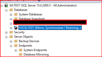 Gelen kod bloğunu gördükten sonra S2\TEST’den ilgili kısımdaki database mirroring’in altındaki endpoint’i siliyorum.