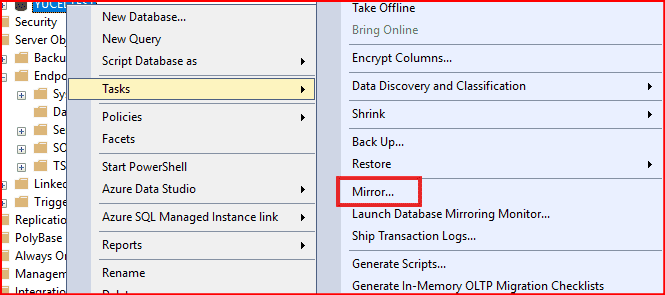 Database mirroring oluşturacağım database üzerine sağ tıklayıp Task>Mirror.. kısmına tıklıyorum.