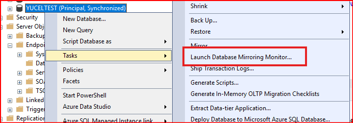 Principal veritabanımıza sağ tıklayıp Task bölümünden Launch Database Mirroring Monitor.. kısmına tıklıyoruz.