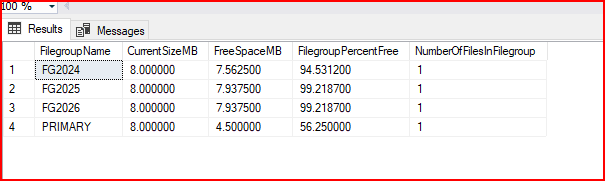 Tekrar yukarıdaki komutla kontrol ettiğimde ilgili filegroup’larda verilerin insert edildiğini ve ne kadar alan kaldığını görebiliyoruz. Bazı değerlere dikkat edersek veritabanımız Primary file group üzerinde büyümektedir. Sebebi herhangi bir nesnenin önceden oluşturulmuş olan primary file group üzerinde oluşturulmasıdır.