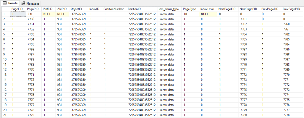 DBCC IND komutunu kullandık sorunun nerden olduğunu NextPagePID veya PreviousPagePID sırasının bozuk olması yani sıralı olmaması ilgi page yapısının bozuk olduğu görülmektedir.