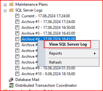SQL Server Logs ifadesinin içinde hangi tarih aralığında olan bir değere bakmak istiyorsak ilgili log dosyasına sağ tıklanıp View SQL Server Log ifadesine girilir.