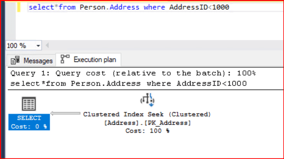 Sorgumuzda filtreleme kullandığımız için index seek işlemini kullandığını görüyoruz. Parantez içerisinde dikkat edersek clustered yazdığını görmekteyiz. Buda primary key kolununda bulunan index’in kullanıldığını göstermektedir.