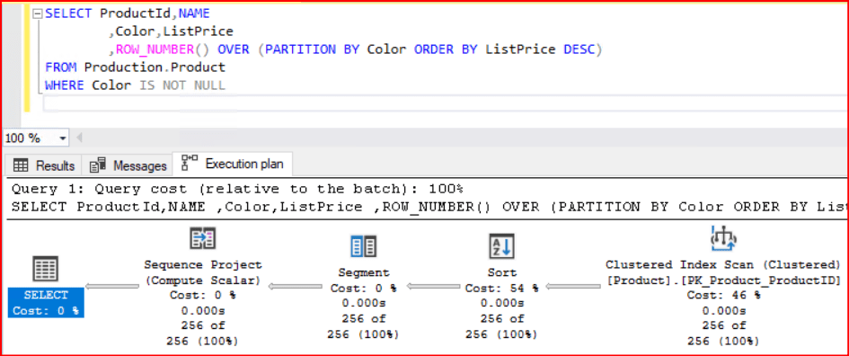Yukarıdaki sorgumuzda Production.Product tablomuzdaki kayıtlarımızı Color değerine göre gruplayarak Row_number() ranking fonksiyonu ile numara verme işlemi yapıyoruz. Bu işlem yapılırken numaralandırma işleminde ListPrice kolonu kullanılıyor. Diğer bir ifadeyle sorgumuz tablomuzda bulunan ürünleri renklere göre gruplandırarak her bir grubu kendi içerisinde ListPrice kolonunu kullanarak sıralıyor ve bu sıralamaya göre bir numara ataması yapıyor. Şimdi sorgumuzun Execution Planını inceleyelim.
