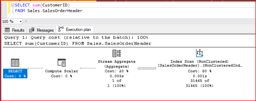 Yukarıdaki ifadede CustomerID kolununun üzerinde Nonclustered Index Scan olduğu için ve elimizdeki veri kümesi sıralı olduğu için SQL Server tarafından gruplama işlemi için Stream Aggregate operatörü tercih edilmiştir