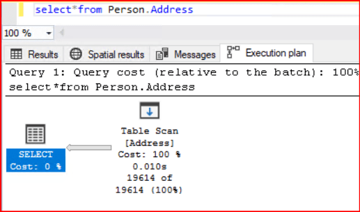 Yukarıdaki sorgu sonucunda tüm tablo sonucu getirildiği için Table Scan işlemi gerçekleşir. Tablomuzda herhangi bir clustered indexs yapısı yoktur. Bazı durumlarda sql server herhangi bir indexs yapısı olmadığı için table scan yapısını tercih etmektedir.