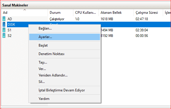 DISK sunucuma yeni bir disk alanı eklemek için hyper-v arayüzünden ilgili sunucu üzerine sağ tıklanır Ayarlar kısmından Donanım Ekle bölümünde SCSI Denetleyicisi seçilir.