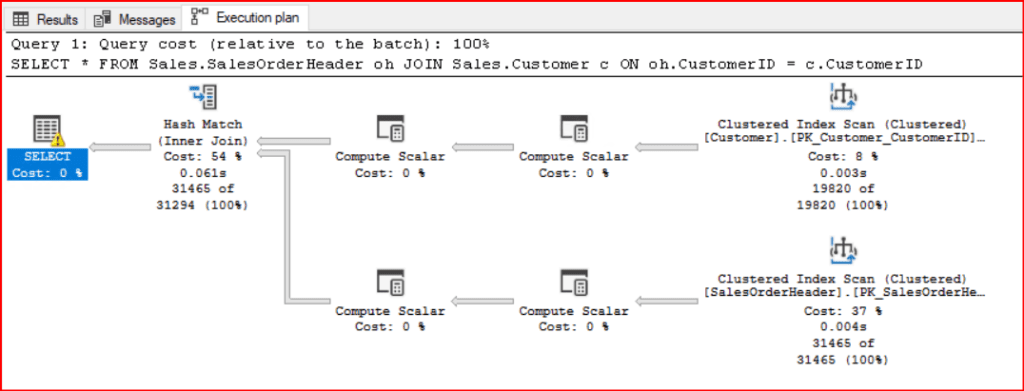 Yukarıdaki Customer tablosunda Clustered Index scan işleminin Clustered Index Seek operatörüne dönüştüğü fast ifademizde 10 kaydın çağrıldığını görmüş oluyoruz. Elde edilen sonuçlar ile Nested Loop Join operatörü ile birleştirilmiştir.