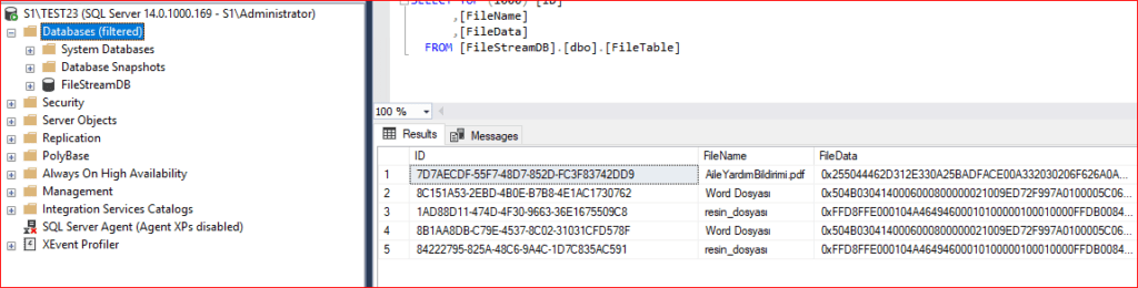 FILESTREAM içeriği normal bir veritabanı yedeğiyle birlikte alınır, yani ekstra bir işlem gerektirmez. Ancak yedeğin eksiksiz olması için FULL BACKUP almanız gerekir. Backup almadan önce file stream tablomuza bakalım.