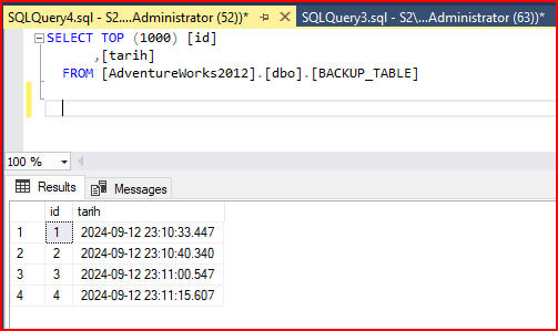 Bunun için elimde bulunan AdventureWorks2012 veritabanı altında BACKUP_TABLE adında bir table oluşturuyorum. Oluşturmuş olduğum bu tabloya anlık veriler atıyorum. Bu verileri tanımlamış olduğum bir job aracılığıyla atıyorum.