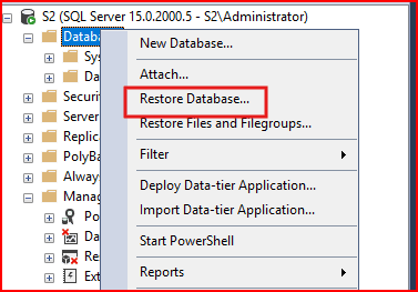 SSMS üzerinde Databases sekmesine sağ tıklayıp Restore Database diyiyoruz.