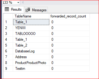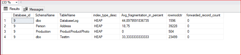 Aşağıdaki komut ile hesap tablolar üzerinde fragmentation oranlarını ve Forwarded record sayısını görebiliriz. Bu komut öncesinde veritabanımızda bulunan hesap tabloların satır sayısına ve boyutuna bakılması gerekmektedir. Sayfamızda bulunan ilgili makalede scripti bulabilirsiniz.