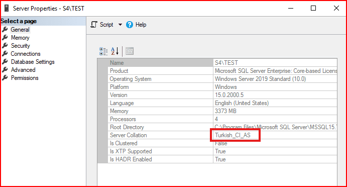 İlgili komutu cmd komut satırında çalıştırdıktan sonra TEST instance üzerinde collation yapımızın değiştiğini görebiliriz.