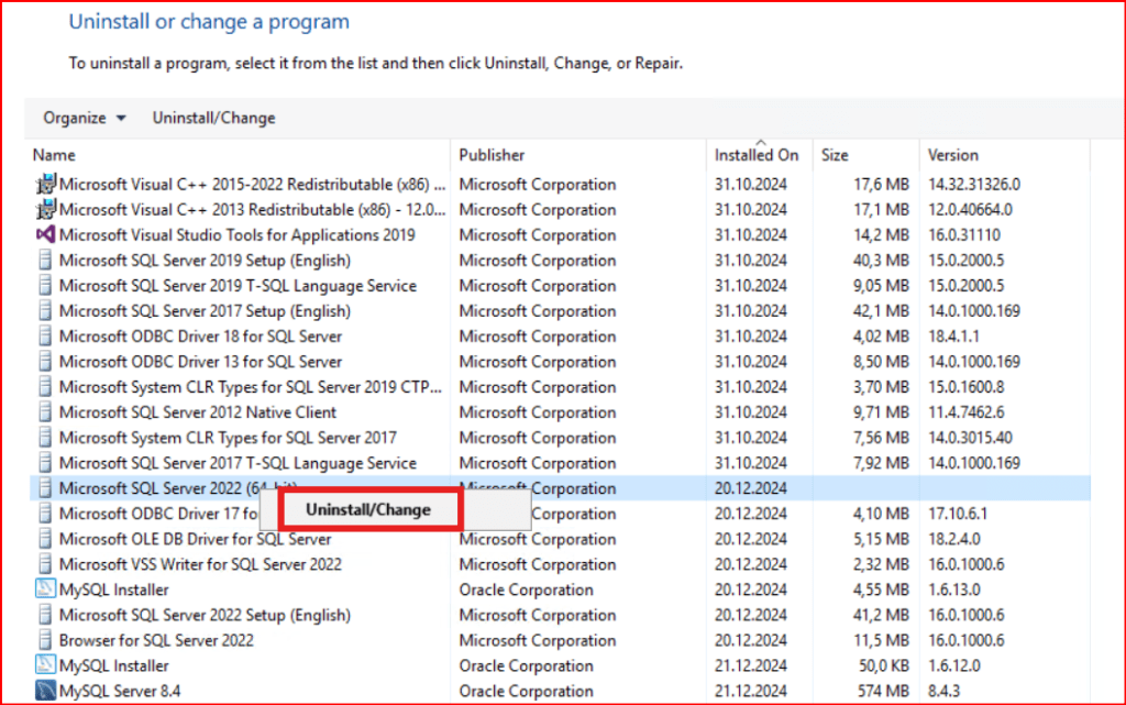 İlk olarak sunucumuzun Control Panel Kısmından Program ve Özellikler bölümüne girilir. Silmek istediğimiz Sql sürümündeki instance için ilgili sql server’a sağ tıklanıp Uninstall/Change kısmına tıklanır.