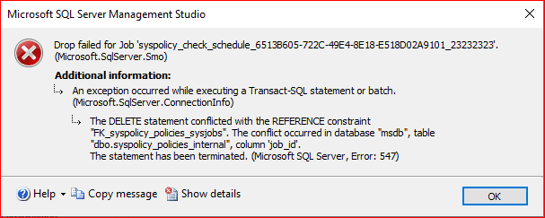 The DELETE statement conflicted with the REFERENCE constraint “FK_syspolicy_policies_sysjobs”. The conflict occurred in database “msdb”, table “dbo.syspolicy_policies_internal”, column ‘job_id’. The statement has been terminated. (Microsoft SQL Server, Error: 547)