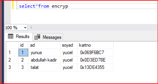 Şimdi başka bir session’da select çekelim tablomuza hangi değer geliyor. Şifrelenmiş şekilde geliyor çünkü verilerimizi artık şifrelenmiş bir şekilde.