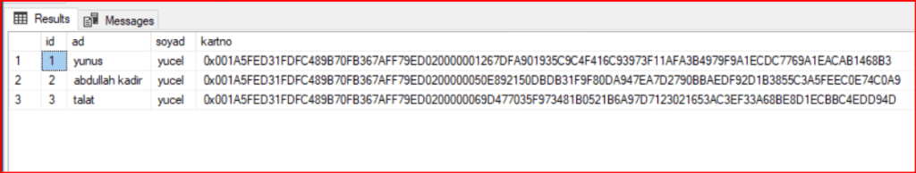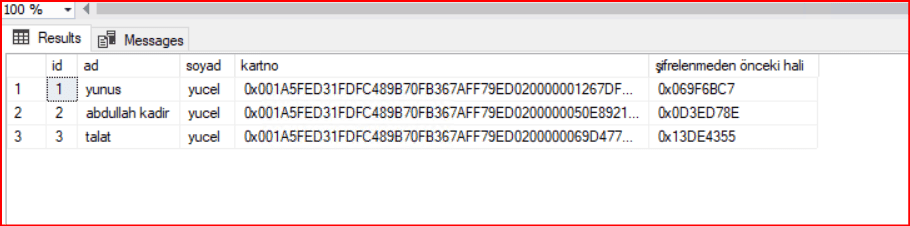 Bu güncellemeyle simetri key i kullanarak kartno’daki değerleri bulunduğu kolona şifreli bir şekilde atıyoruz.