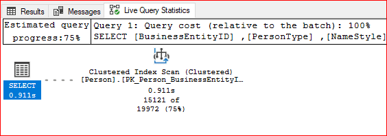 Live query statistics ile sql server canlı olarak hangi veriyi okuduğunu yüzdelik olarak ne kadarının tamamlandığını görebiliriz. Noktalı ifadeler sorgunun devam ettiğini göstermektedir.
