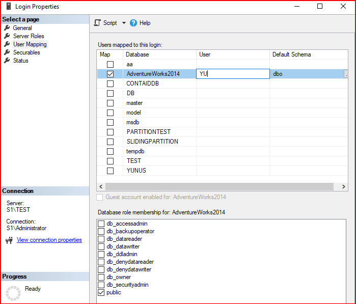Login’in user mapping bölümünde hangi db altında tanımlanmasını istiyorsak onu seçeriz ve aynı isimde user oluşur. Ayrıca user ismini kendimizde ssms arayüzünden ya da aşağıda bulunan script yardımıyla yapabiliriz.