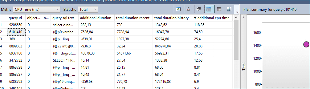 Aşağıdaki resimde sağ bölümde bulunan summary for query bölümü sol tarafta seçilen query id planlarının göstermektedir. Query id ve diğer ifadelere göre filtreleme işlemlerini yapabiliriz.