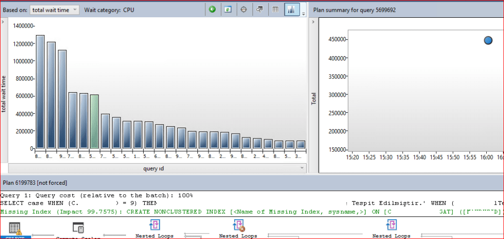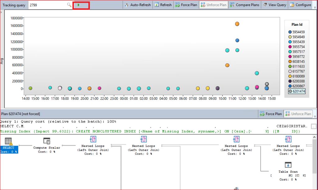 Query id değerindeki her sorgunun sağ tarafında plan id’leri görülmektedir. Burada ilgili planı seçip Force edebiliriz. Query id ile seçilen sorgumuzun execution plan’ını alt kısımda görebiliriz.