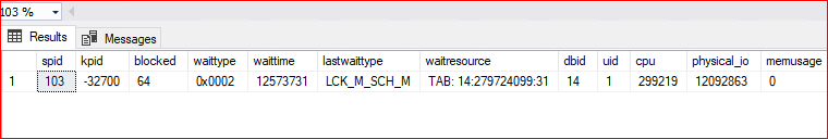Kendi sistemimizde 103 numaralı session değerinin kill edilememesinin sebebi dbcc checkdb komutunun çalışmasından dolayıdır. LCK_M_SCH_M ifadesini gördükten sonra sisteminizi yorumlayarak hangi işlemin tabloyu locklayacağını yorumlayabilirsiniz.