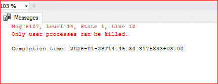 Bu hata mesajını veya ilgili session yapısını kill ettiğimde 103 SPID’li session bir SYSTEM session olduğunu bu neden kill edilirken Only user processes can be killed hata mesajını döndüğü görülmektedir.
