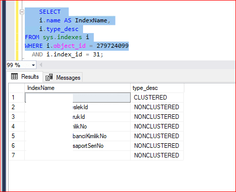 Başlangıçta tabloyla almış olduğumuz object_id değeriyle tablo üzerinde hangi index yapısının olduğunu görmekteyiz.