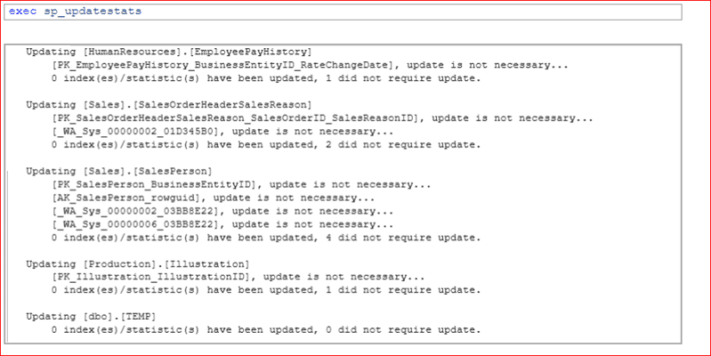 Sp_updatestats ile istatistikler güncellenirse, aşağıdaki mesajı alırız.