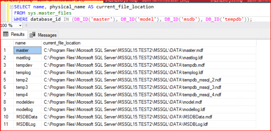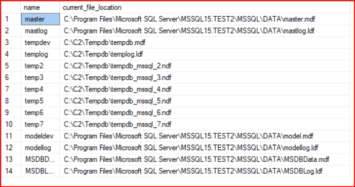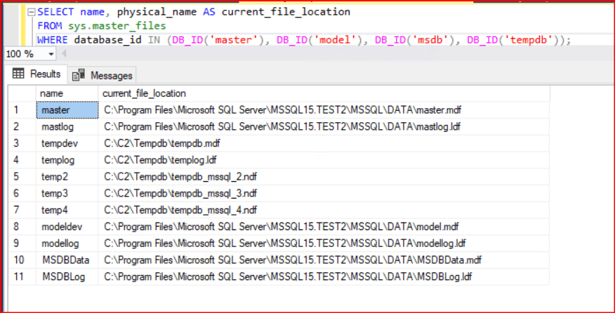 System rebuild işlemine geçeden önce system databaselerinin hangi pathlerde olduğunu öğrenmemiz gerekmektedir. Aşağıdaki komut ile system databaselerinin konumunu öğrenebiliriz. Örneğin tempdb farklı bir disk altında oluşturulduğu için yolunun öğrenilmesi gerekir. Diğer system dosyalarının C disk’i altında oluşturulması tavsiye edilen yöntemdir.