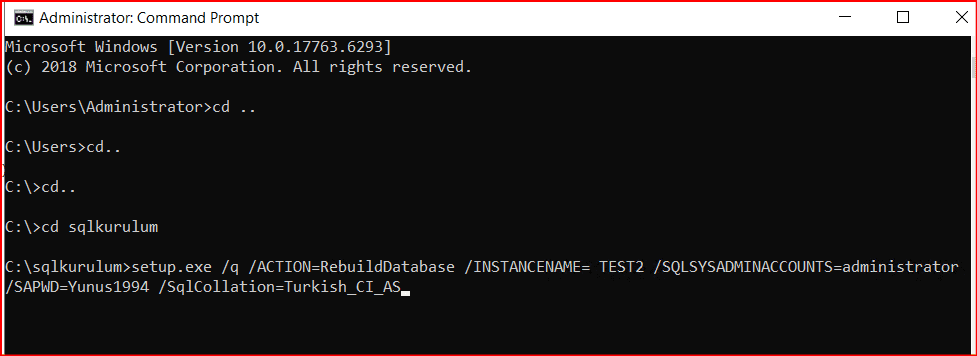 setup.exe /q /ACTION=RebuildDatabase /INSTANCENAME= TEST2 /SQLSYSADMINACCOUNTS=administrator /SAPWD=Yunus1994 /SqlCollation=Turkish_CI_AS