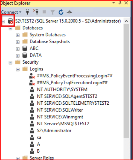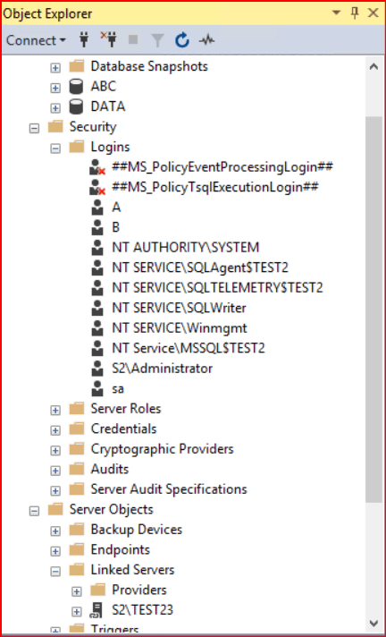 SSMS arayüzün de S2\TEST2 instance’ına girdikten sonra database, login, linked server yapımız ve sp_configure ayarlarının geldiğini görmüş oluyorum.