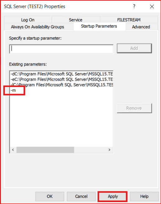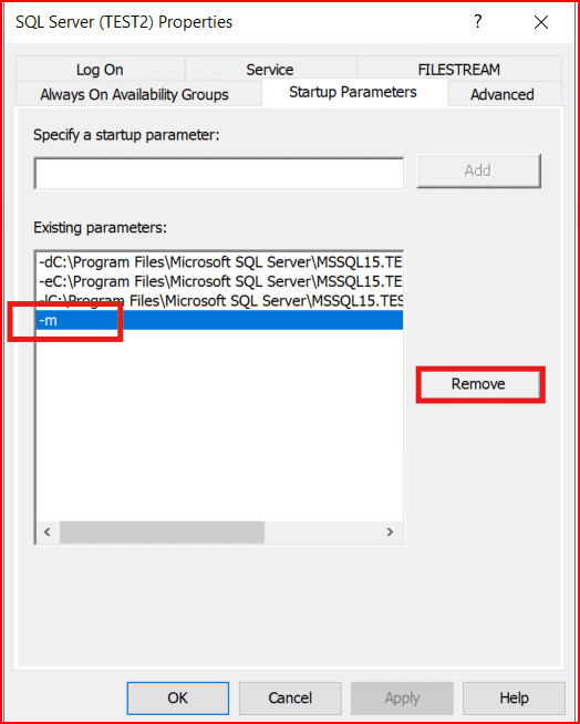 Sql Server Configuration Manager ekranından ilgili instance’a sağ tıklayıp properties ekranında Startup Parameters kısmına girilip sql server bakım modu olan –m startup parametresi yazılır. Add denilip eklenir.