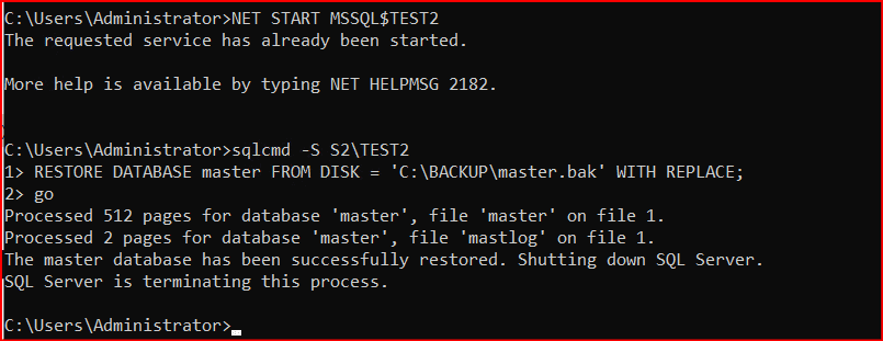 RESTORE DATABASE master FROM DISK = 'C:\BACKUP\master.bak' WITH REPLACE;