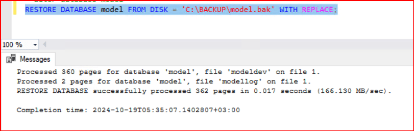 RESTORE DATABASE model FROM DISK = 'C:\BACKUP\model.bak' WITH REPLACE;