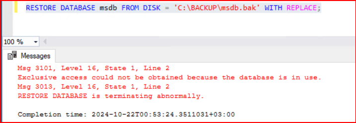Hata mesajı almamızın sebebi Sql Agent Servisinin çalışmasından dolayıdır. Sql Agent servisi kapatılıp tekrardan yukarıdaki msdb backup komutu çalıştırılabilir.