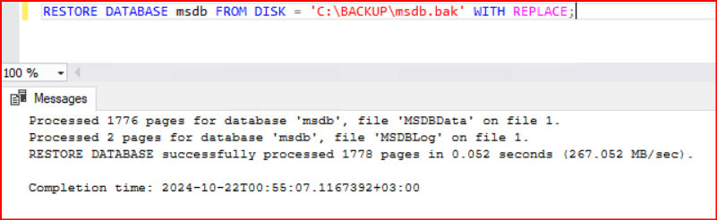RESTORE DATABASE msdb FROM DISK = 'C:\BACKUP\msdb.bak' WITH REPLACE;