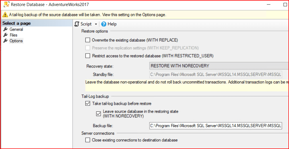 Herhangi bir sebepten aktif çalışan bir veritabanını aynı instance altına Restore etmek istediğimizde aşağıdaki resimde görüldüğü gibi A tail-log backup of the source database will be taken. View this setting on the Options page. SQL Server’ın mevcutta çalışan veritabanını korumak için aldığı son derece kritik bir güvenlik önlemidir.